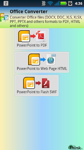 - Office Converter (Word, Excel) FREE. Convert Word, Excel and PowerPoint to PDF, WebPage(HTML), Flash (SWF), RTF and TXT. Add password in PDF files.